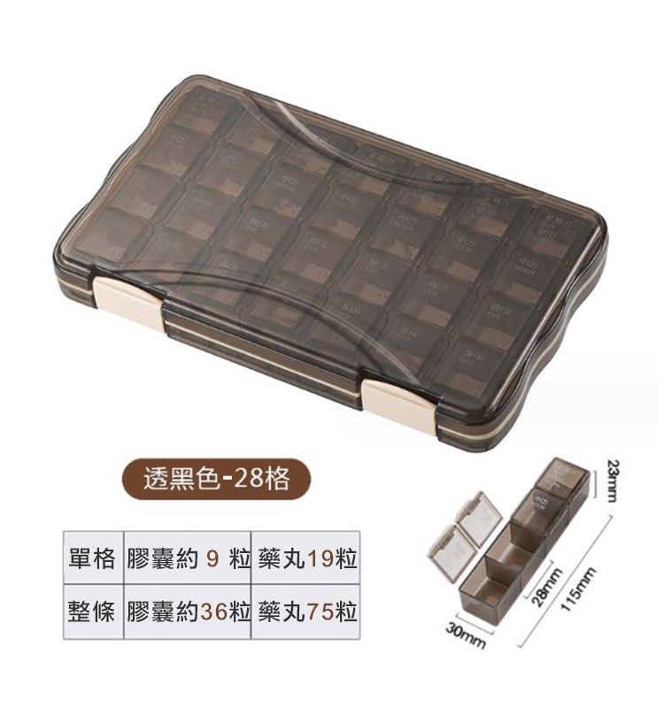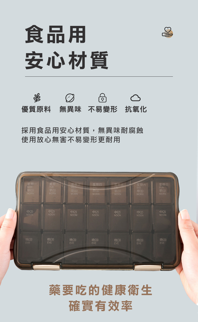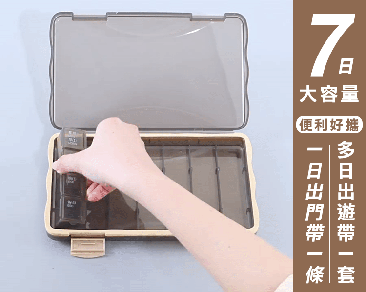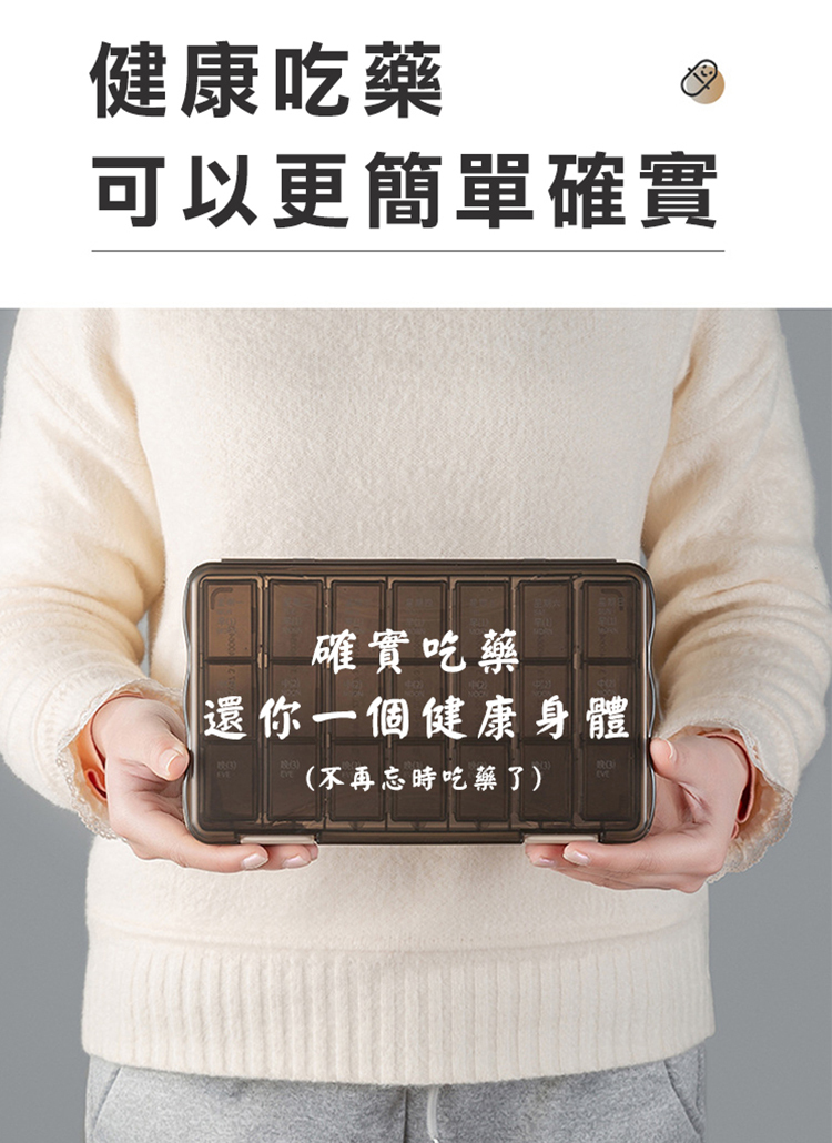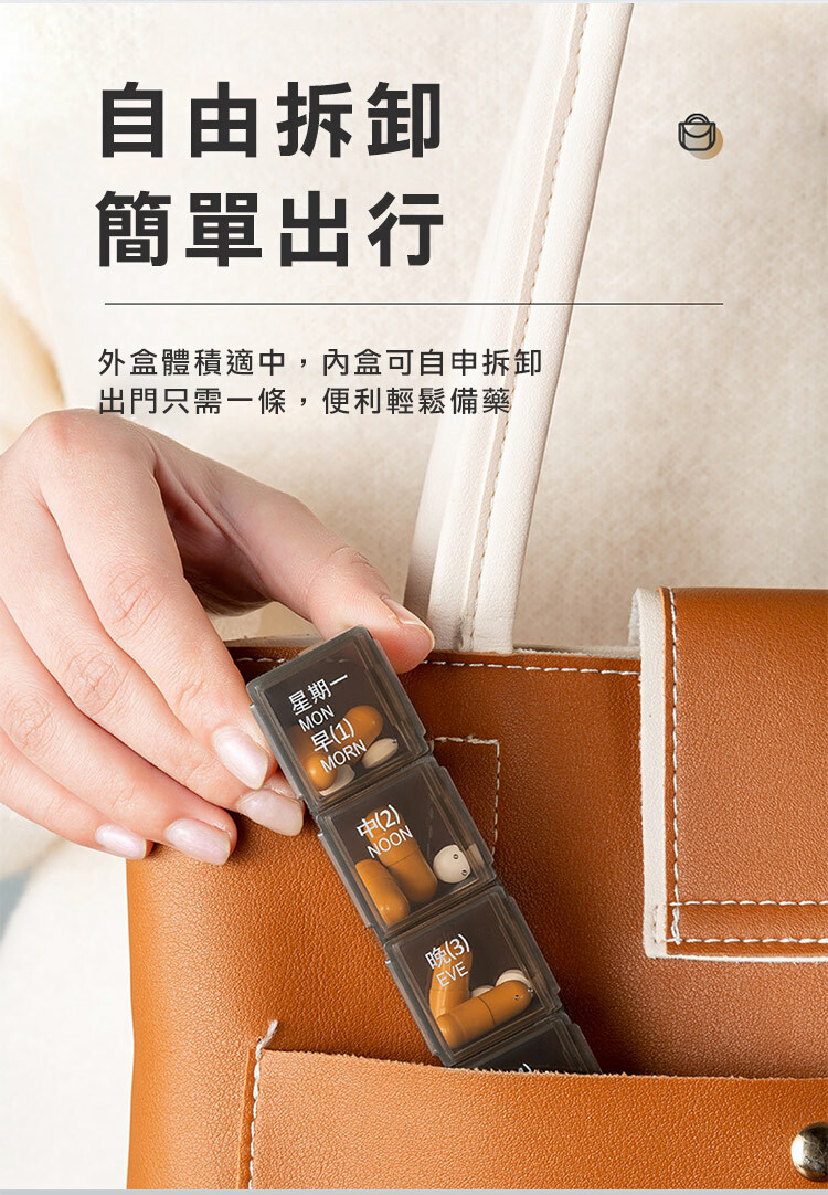 常常忘記吃藥或者找不到藥物嗎?出門帶一整包藥物好麻煩...便攜可拆裝衛生密封七日藥盒,大容量可裝七日份,可拆裝出門只需帶一條內盒,便利好攜帶,分格印刷早、中、晚+(備註),最適合長輩時常忘記有沒有吃藥了,食品級用PP材質,防潮矽膠密封條水,每格區格分明,分裝不變質,讓吃藥變得更簡單更有效率!還你一個健康身體~