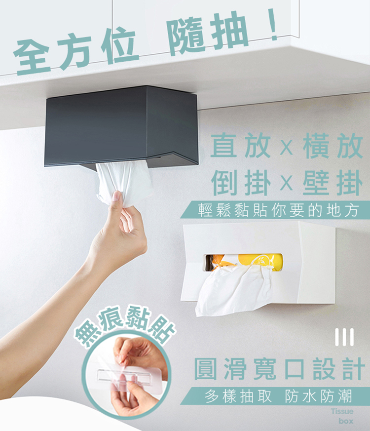 多方位無痕隨抽時尚面紙盒,使用防水無痕貼片,無論直放、橫放、倒掛、壁掛,只要方便隨你抽,不再單一方位抽取,便利使用大加分,捲紙、垃圾袋也可放置,俐落設計隨便放都是一種時尚品味,居家、臥室、衛浴、餐廳皆合適,生活便利時尚就是這麼簡單!