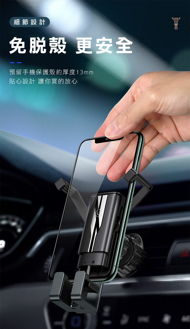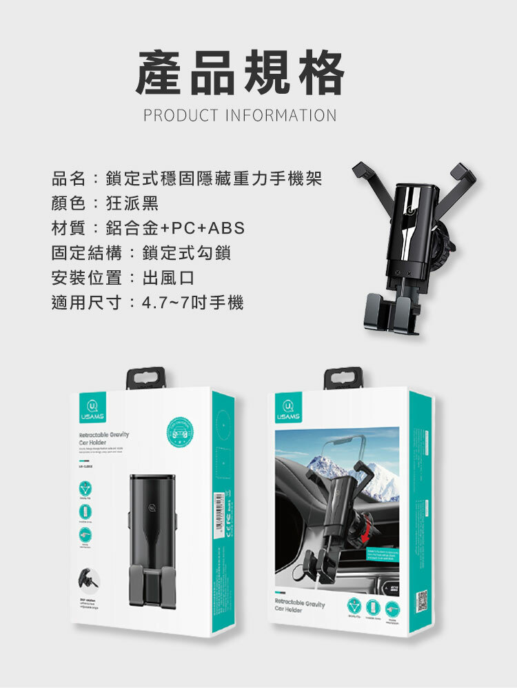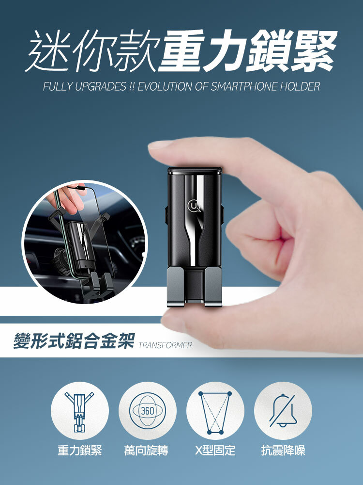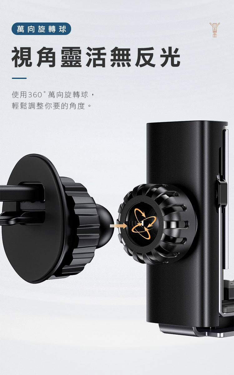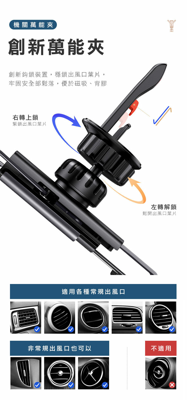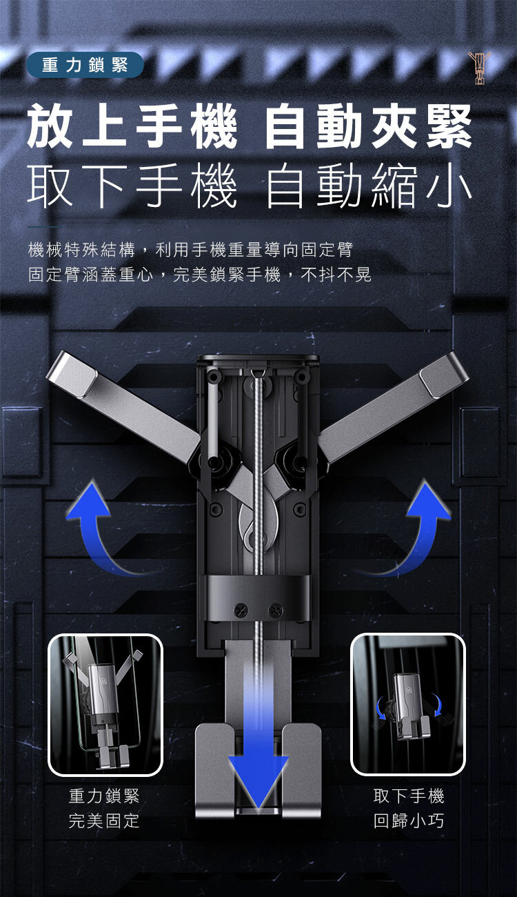 市面上有各式各樣的車用手機支架,有的不牢固易摔傷寶貴的手機,有的體積太大,擋住出風口阻擋風量,來試試新款的鎖定式穩固重力手機架。體積小,收合面積僅33x80mm,機械特殊結構,重力鎖緊完美固定。超廣角夾臂 適用市售4.7~7吋手機。360萬向旋轉球 輕鬆調整固定。創新機關萬能夾穩穩鎖定出風口葉片 安全不鬆落。預留充電空間 充電更便利。輕巧實用行車必備款~快來試試吧!
