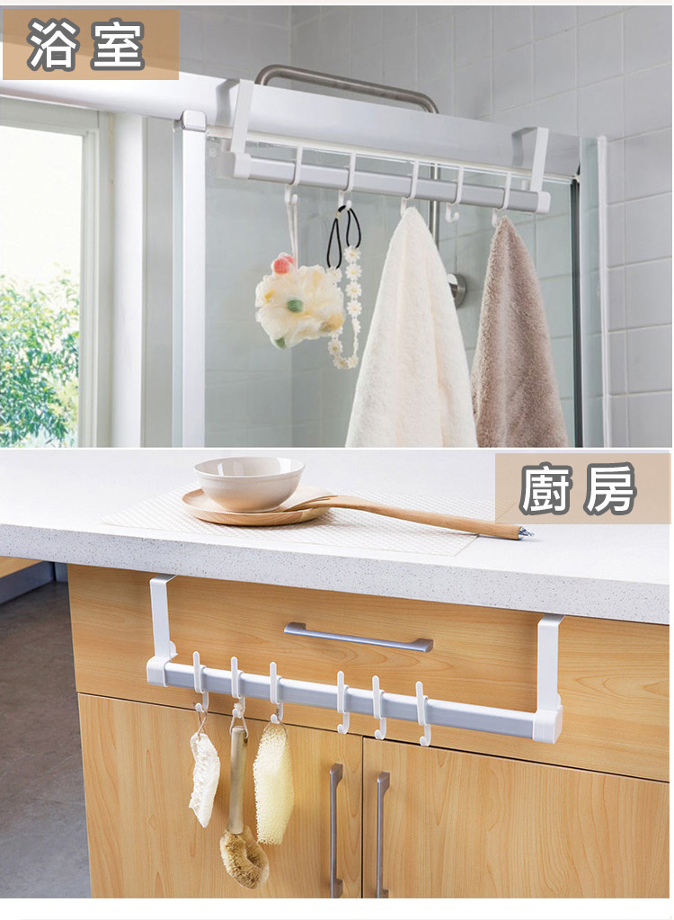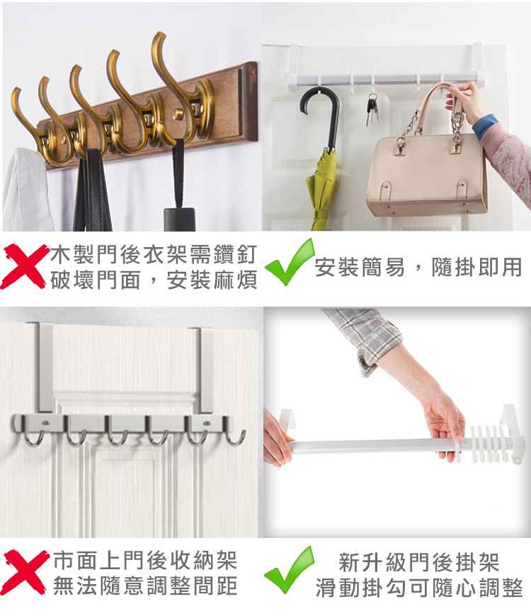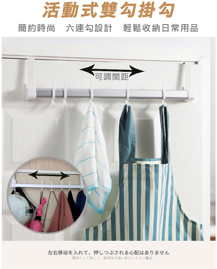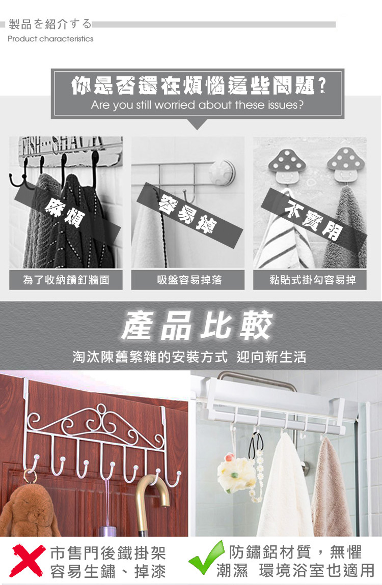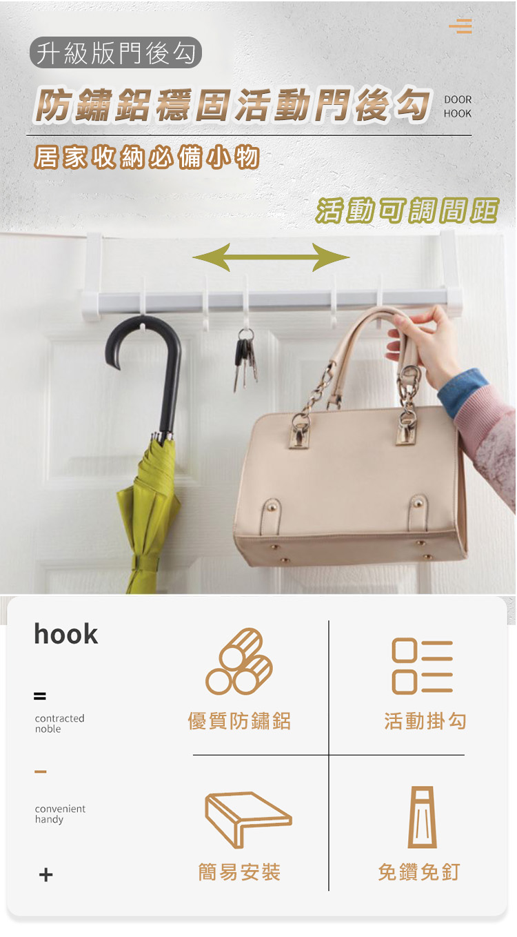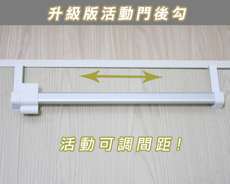 新式防鏽鋁穩固活動門後勾,不怕潮濕環境,防鏽又輕盈,耐重又耐用,一掛就上免安裝,可活動調整間距,不怕空間浪費掉,獨特上下雙勾設計,收納再晉級,沒有比它更強的門後勾了!